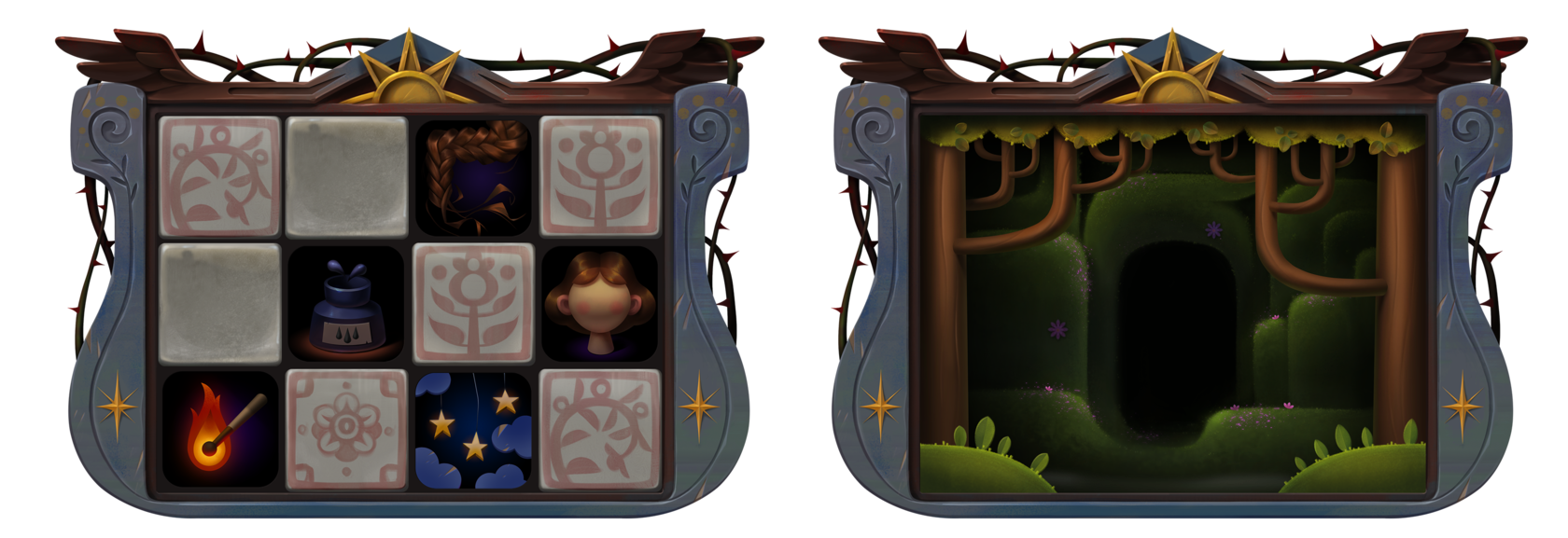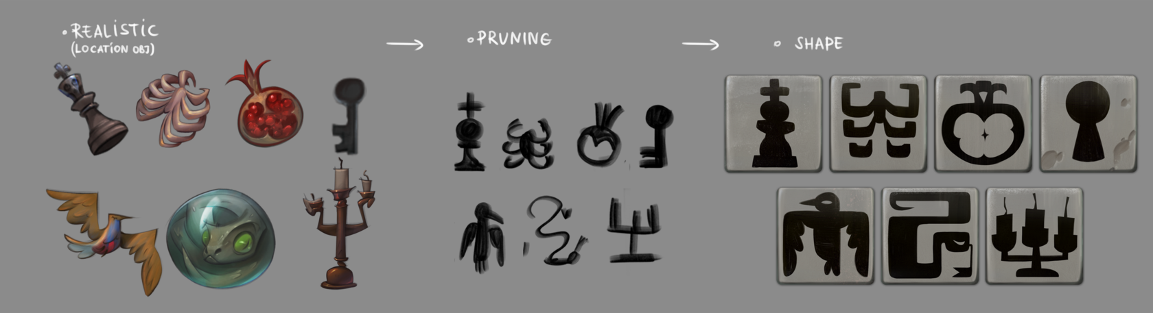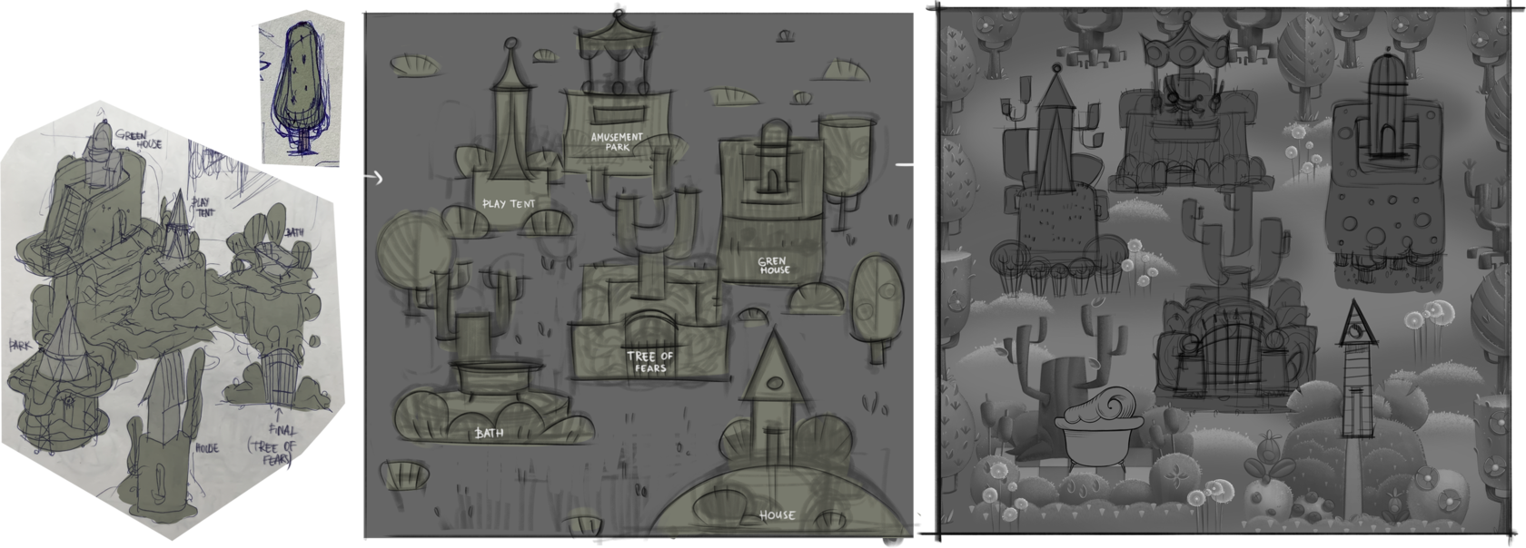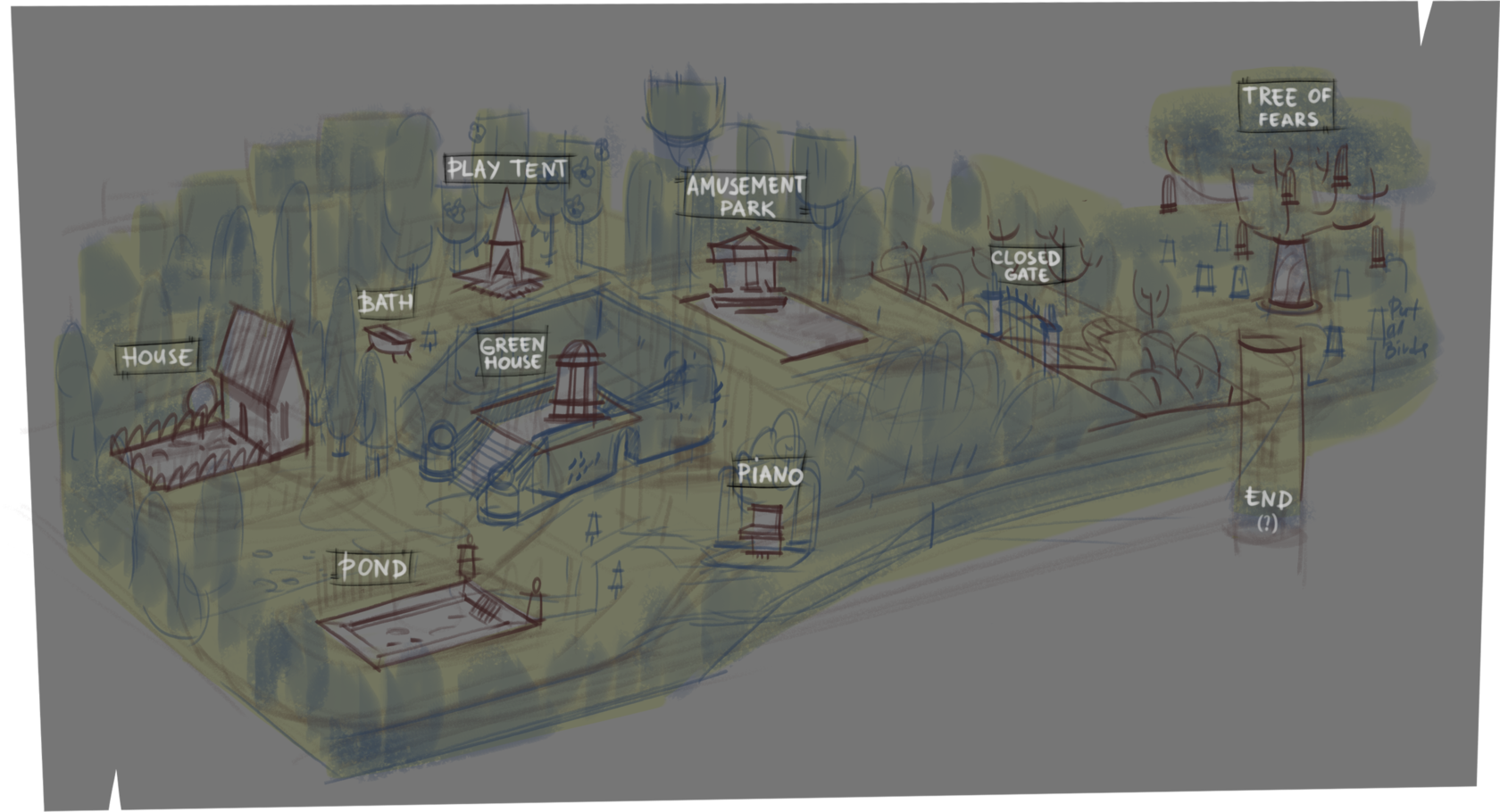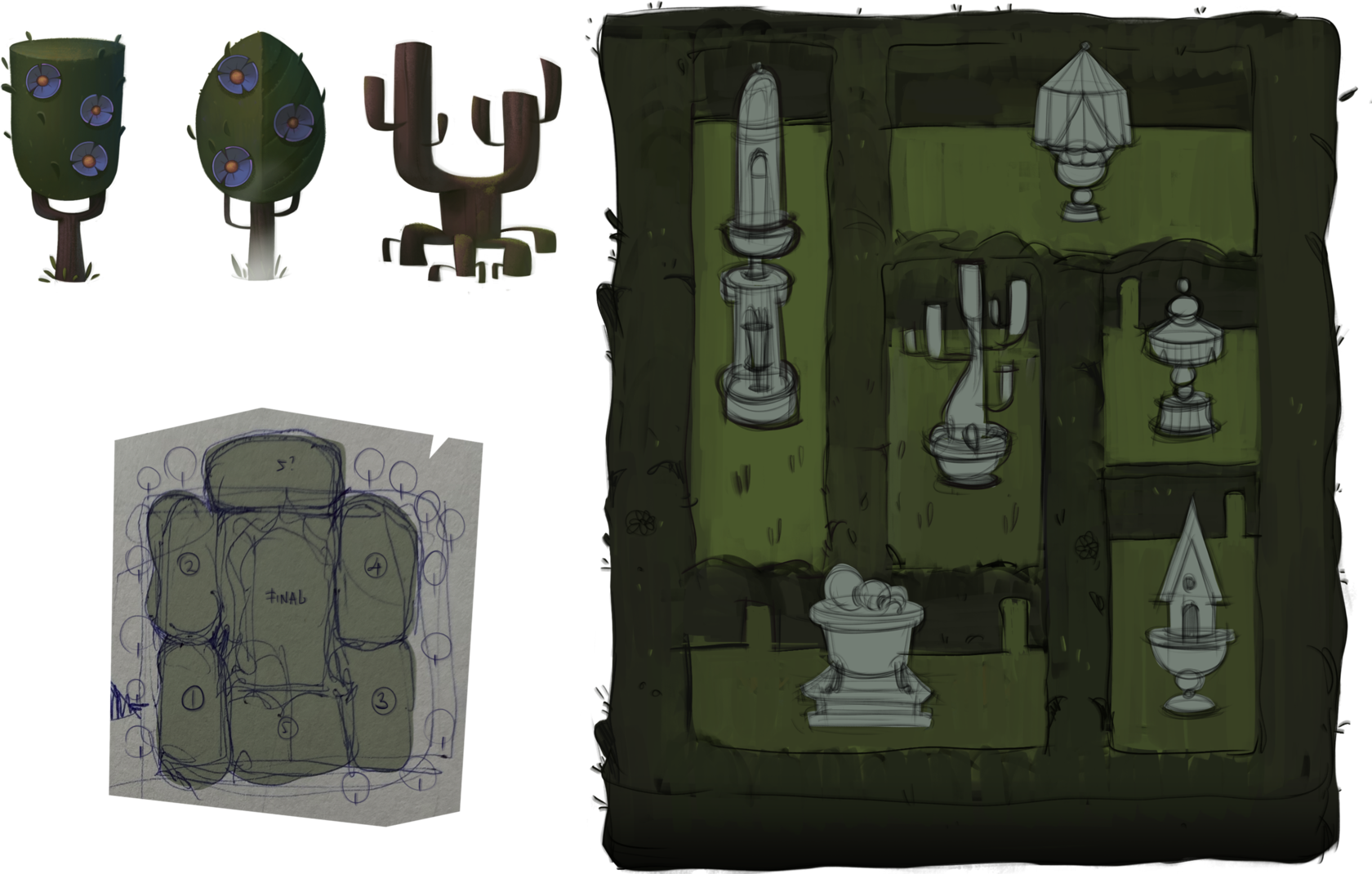In the first concepts, the map resembled a forest with small patches of locations. In the final version, the map is a labyrinthine garden, and the locations are small statues.