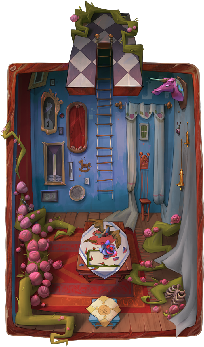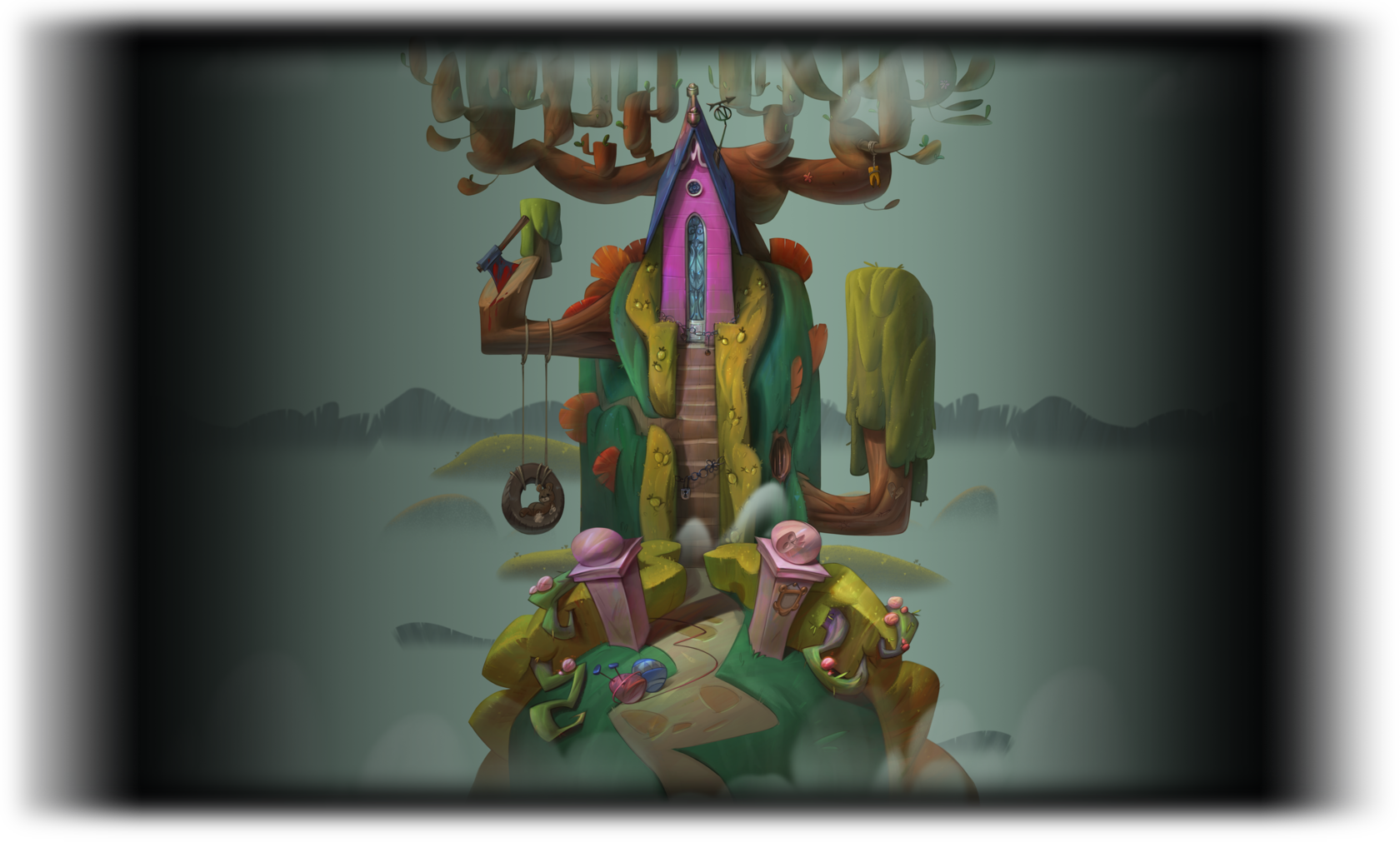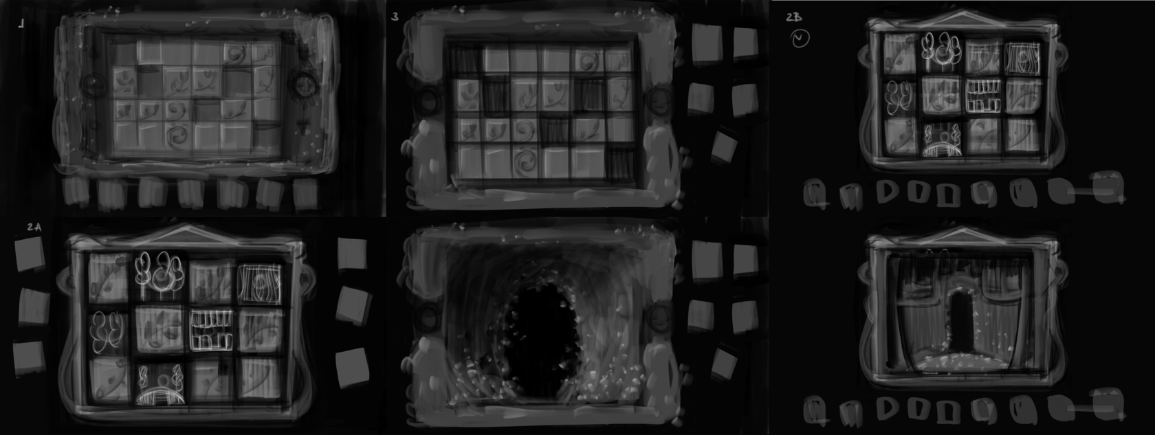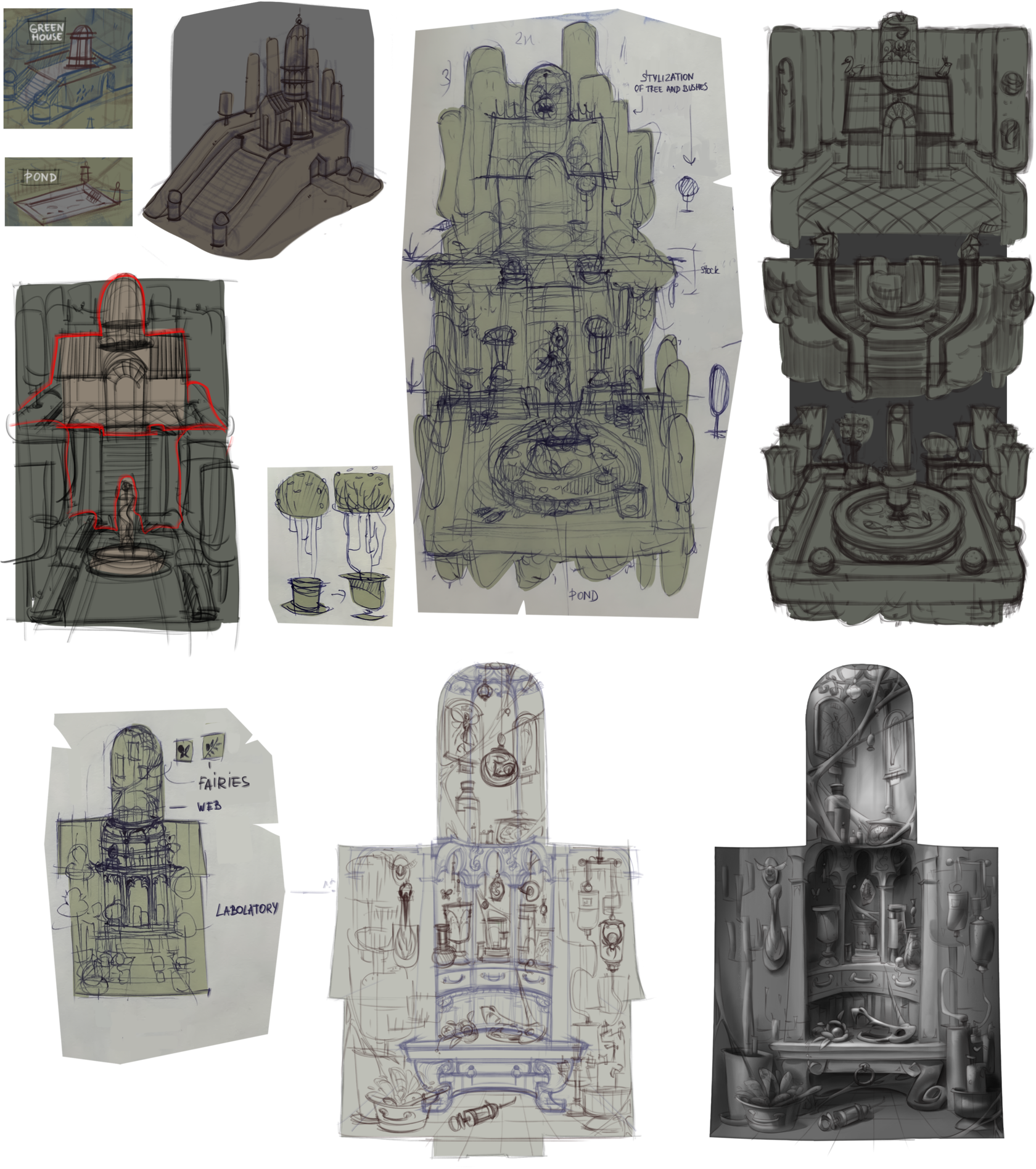 In the first concepts, the map resembled a forest with small patches of locations. In the final version, the map is a labyrinthine garden, and the locations are small statues.